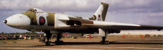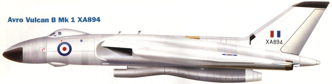 Vulcan В. Mk 2А из 617-й эскадрильи, вооруженный ядерной ракетой Blue Steel. Оригинальная серебристая окраска в 1957 году была заменена на белую, уменьшающую воздействие от вспышки атомного взрыва, со специальными тусклыми эмблемами и серийными номерами.