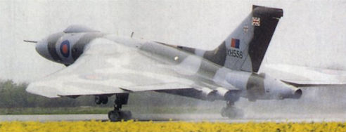 Регистрационный номер: XH558 [32], G-VLCN [32] Vulcan XH558 blasts off from Farnborough's runway at the start of its four displays there that week in mid-July. The routine lasted six minutes, though this is planned to be extended by two minutes in 2009, when it may feature more energetic manoeuvres.