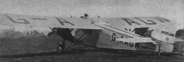 Регистрационный номер: G-AAGW [12] The Westland IV small commercial aeroplane was a three-engined type.