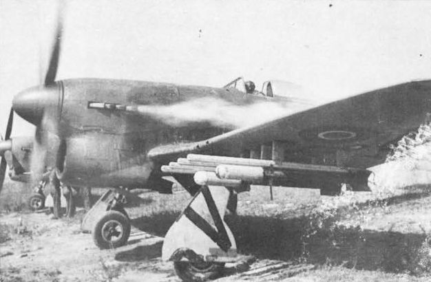 Typhoon оказался весьма эффективным самолетом при решении задач по штурмовке наземных объектов - в этом случае он вооружался бомбами и реактивными снарядами. Хорошо заметны отличительные особенности - радиатор и кожухи пушечных стволов.