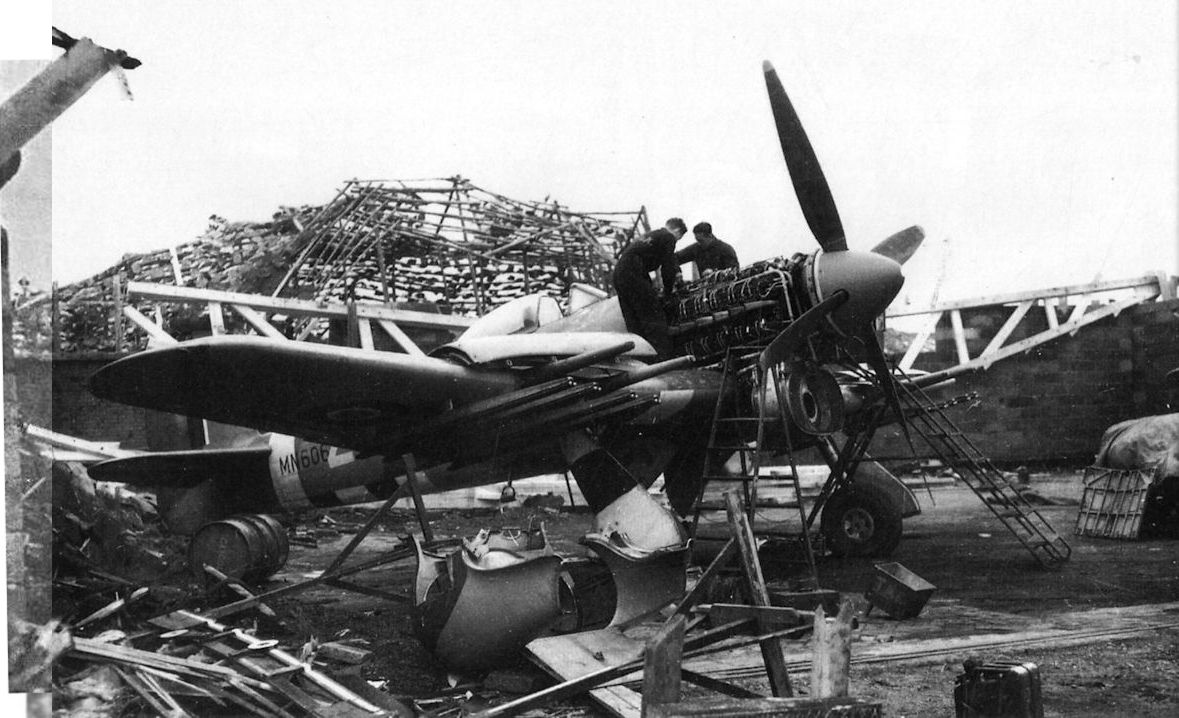 Типичная картина на аэродромах, где в 1942гг. базировались эскадрильи, оснащенные новейшими истребителями-штурмовиками "Тайфун" - после посадки на брюхо из-за отказа двигателя самолет поднят на шасси, и теперь предстоит замена воздушного винта и радиатора, а также переборка всей силовой установки
