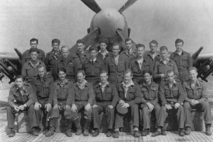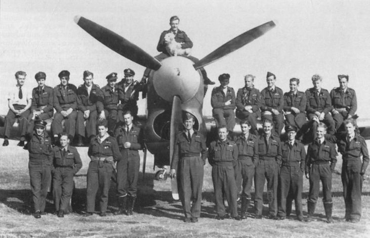 Пилоты 266-й родезийской истребительной АЭ на фоне истребителя-бомбардировщика Хоукер «Тайфун» IA, 1942 г.