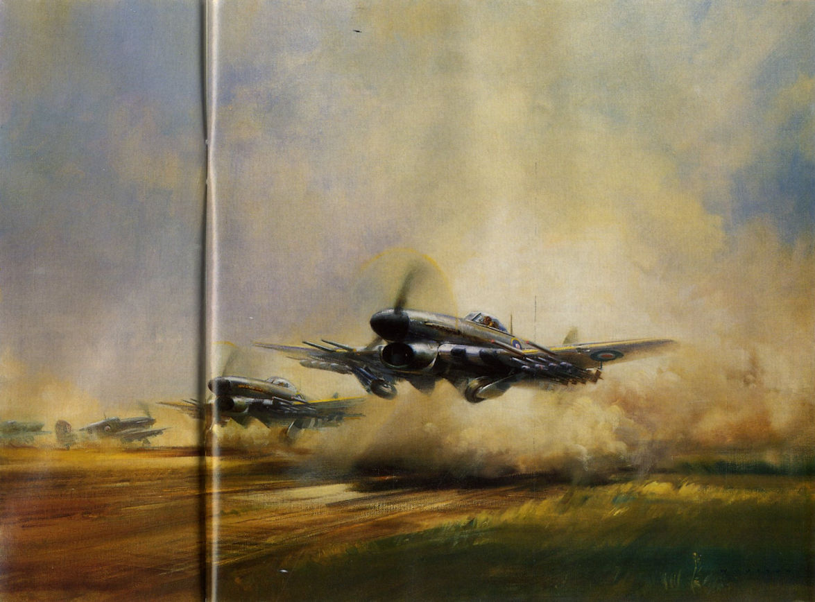 Frank Wootton’s dynamic portrayal of Typhoons taking off from a dusty Normandy airstrip to harass the German Wehrmacht was based on the artist’s first-hand observations of these operations during the long, dry summer of 1944.