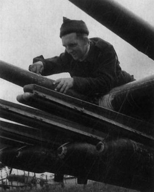 Пожалуй, самым эффективным оружием Typhoon стали 27-кг ракеты (реактивные снаряды) с фугасной боевой частью. Оружейники британских ВВС снаряжают ракеты, на заднем плане Typhoon из 175-й эскадрильи в ожидании очередного боевого вылета, конец сентября 1944 года. -