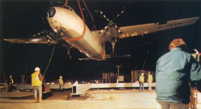 Регистрационный номер: G-CEXP A welcome addition to the skyline at Gatwick is Dart Herald G-CEXP, seen here being lowered into position on the Skyview terrace atop the South Terminal.