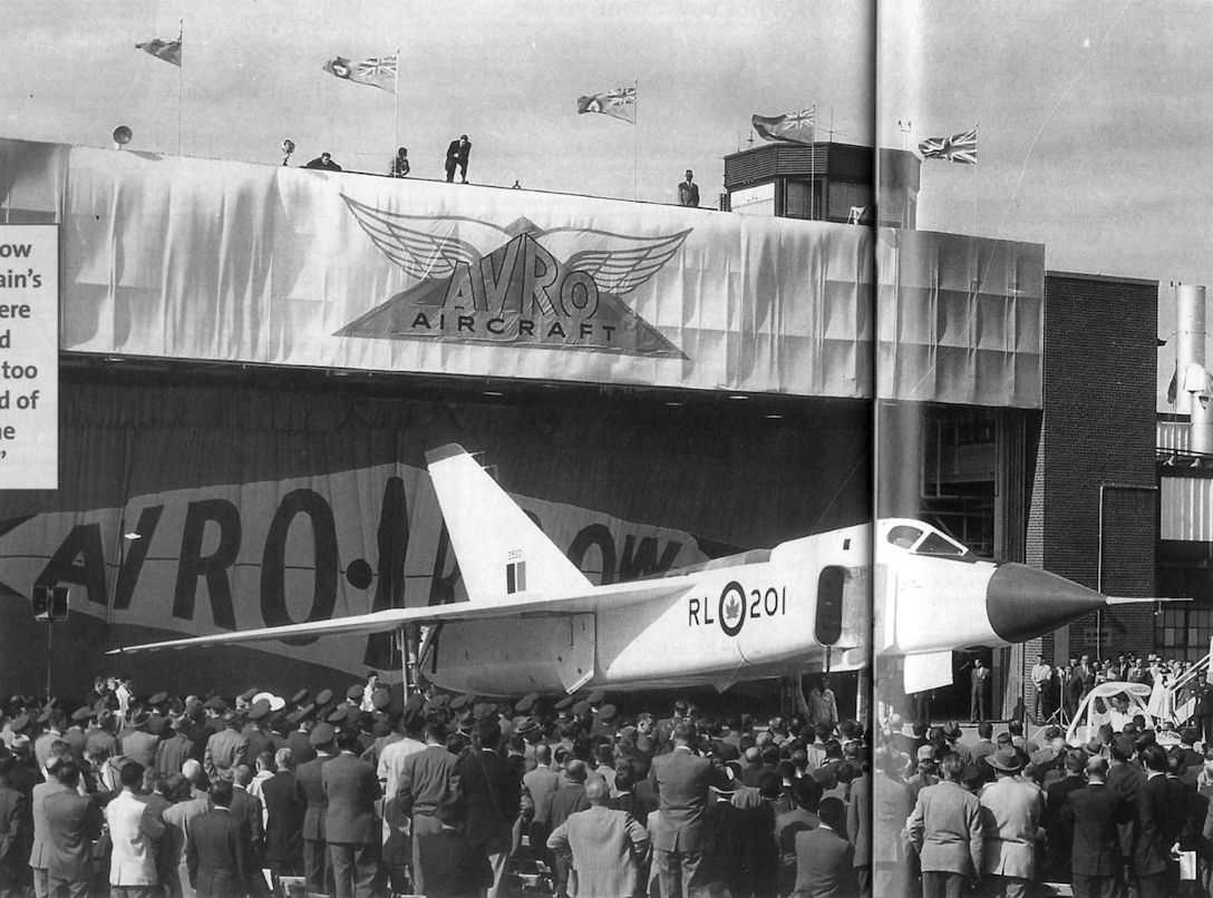 The roll-out of the first Avro Canada Arrow at Malton, Ontario, on October 4, 1957.