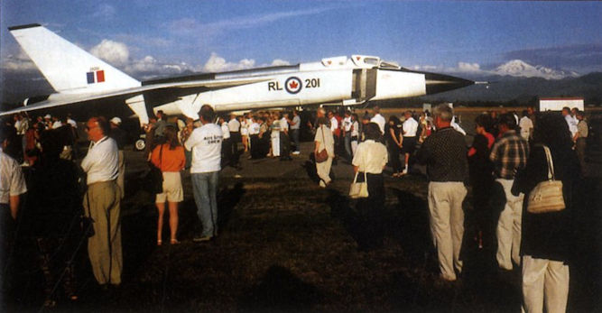 Newly unveiled at Abbotsford in 1997, the Avro Canada CF-105 Arrow replica stands in the setting sun with snow-capped Mount Baker (USA) in the background.