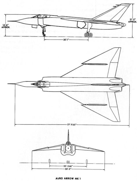 A three-view line drawing illustrates the futuristic lines of the Arrow. It was was one of the largest fighters of its time.