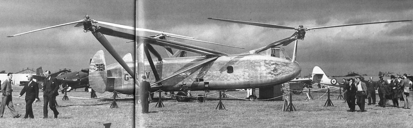 Регистрационный номер: VZ724 [16], G-ALCV [16] By this time fitted with fins of increased area, VZ724 clatters overhead during a flight in 1949, possibly at that year’s SBAC show, at which it performed a memorable flying display. The fins never incorporated rudders, yaw control being effected by means of fore-and-aft cyclic-pitch variation applied differentially to the rear rotors.