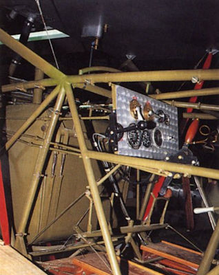 This view of the instrument panel area, taken before the welded steel-tube fuselage was covered, shows the aircraft’s complement of wonderfully “antique” control switches and levers.