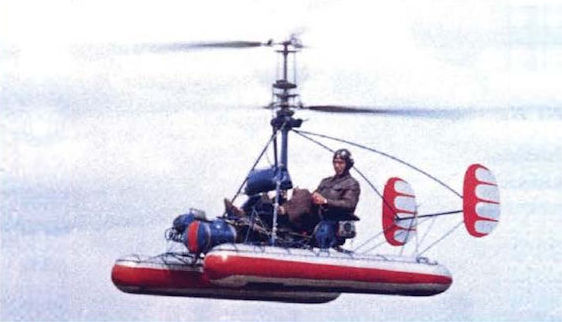 Twin fins are the main distinguishing feature of the Ka-10 when compared with the Ka-8. To facilitate emergency evacuation of the Ka-8 or Ka-10 in flight the seat back was designed to fold allowing the pilot to fall out backwards with his parachute. The Ka-10M is seen here landing on a truck platform in 1955.