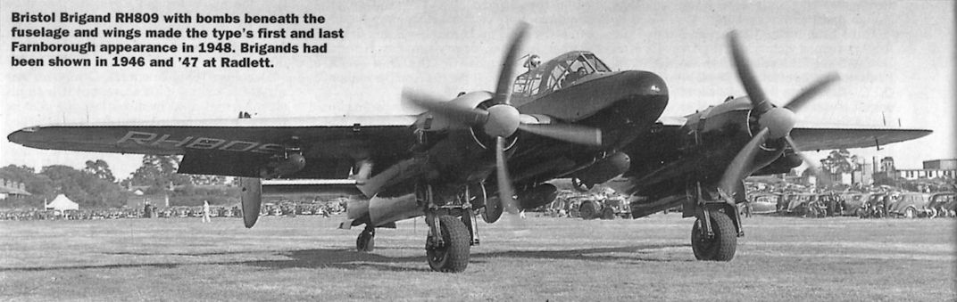 Регистрационный номер: RH809 [2] Bristol Brigand RH809 with bombs beneath the fuselage and wings made the type's first and last Farnborough appearance in 1948. Brigands had been shown in 1946 and '47 at Radlett.