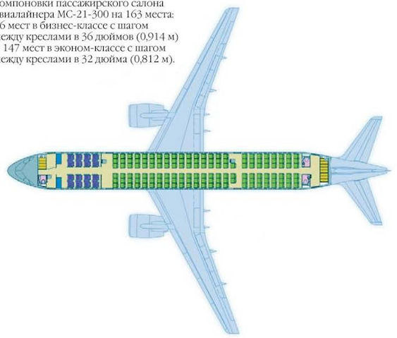 Один из вариантов двухклассной компоновки пассажирского салона авиалайнера МС-21-300 на 163 места: 16 мест в бизнес-классе с шагом между креслами в 36 дюймов (0,914 м) и 147 мест в эконом-классе с шагом между креслами в 32 дюйма (0.812 м).