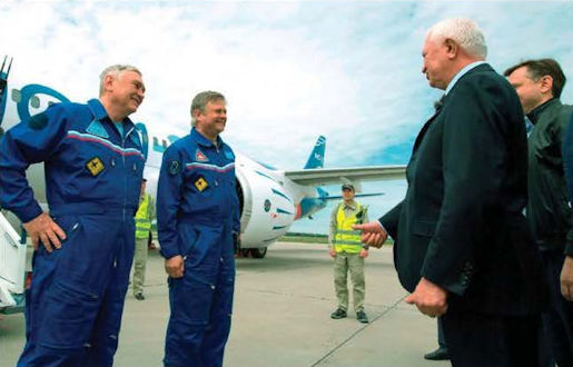 Командир экипажа докладывает Генеральному конструктору Олегу Демченко об успешном завершении первого полёта МС-21