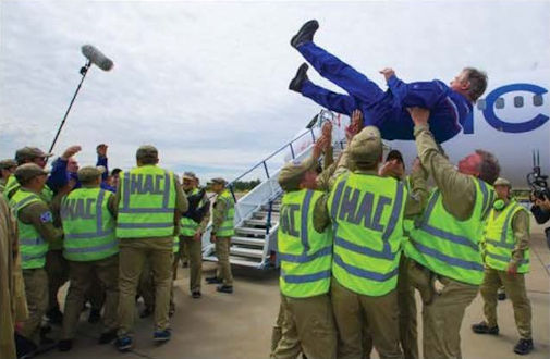 «Качать их, ребята!..» - традиционные «взлёты» экипажа испытателей после успешного завершения первого полёта.