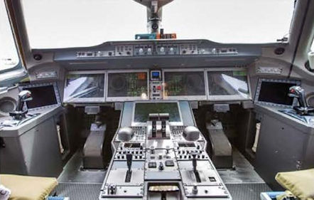 Интерьер пилотской кабины с ЖК-дисплеями и панелью управления силовой установкой.