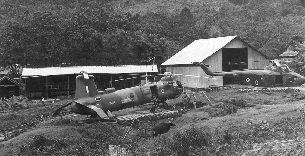 Регистрационный номер: XR454 Belvedere XG464 with Whirlwind XR454 in primitive surroundings at Nanga Gat. The longhouse in the background carries a noticeboard identifying it as a base for 110 Squadron, operators of the Whirlwind.