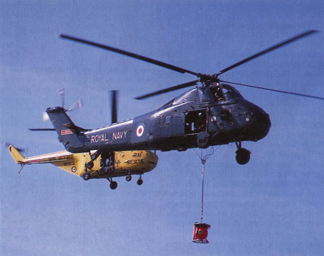 Whirlwind HAS.Mk 7 из 829-й морской эскадрильи отрабатывает действия по спасению на море. Основной задачей подразделения было обучение экипажей противолодочных машин, но оно также выполняло поисково-спасательные операции в заливе Портленда.