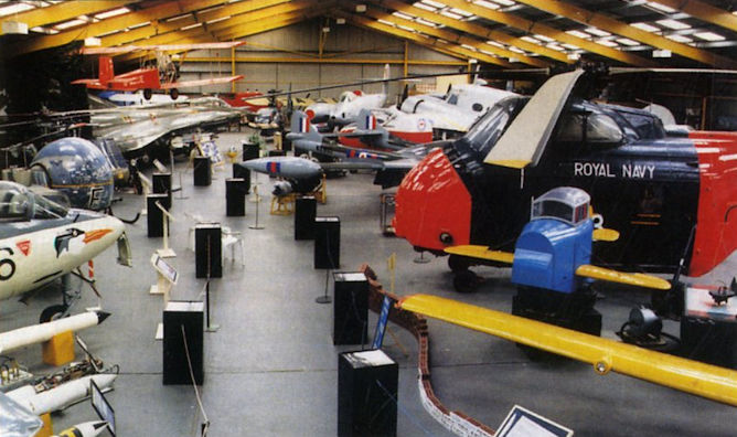 A crowded exhibition hall at the Newark Air Museum shows the wide variety of aircraft on display.