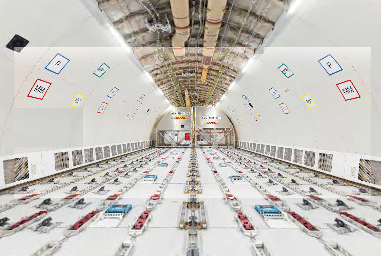 A view of the interior of the first A330P2F for DHL, which has ordered eight aircraft and has options on ten more. The A330-300P2F will carry up to 61,000kg (134,500 lb) of cargo.