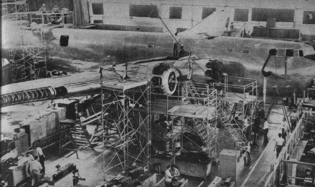 DEMOCRACY'S SWORD AND ARMOUR: The wing and fuselage of the Douglas B-19 bomber join company in the factory at Santa Monica where this great aeroplane is under construction for the U.S. Army Air Corps. The hoses going in through the cockpit windows are probably for sucking out or delivering ventilating air.