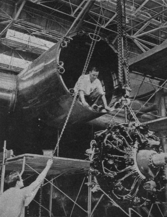 Installing one of the 18-cylinder two-row Wright Duplex Cyclones, which have a take-off rating approximating 2,000 h.p. Attachment is by "dynamic mounting" to the cylinder heads at the nine points seen on the nacelle.