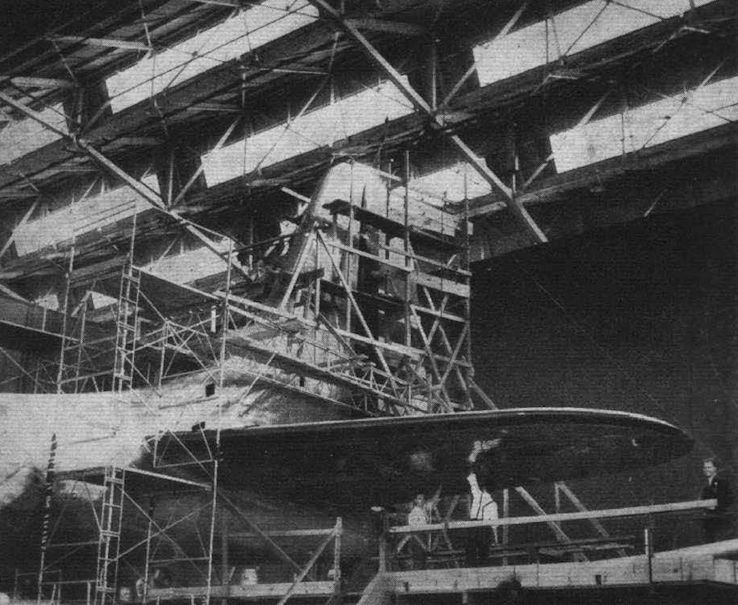 The rear section of the fuselage of the Douglas B-19 bomber, under construction in the company's Santa Monica works. With a wing span of 210ft. and a gross weight of 70 tons, it will dwarf all other aircraft. The colossal proportions of the single fin may be seen, and the tailplane appears as large as the wing of many a transport aeroplane. There appears to be a circular turret opening in the top of the fuselage. Note the screens hung from the roof for secrecy.