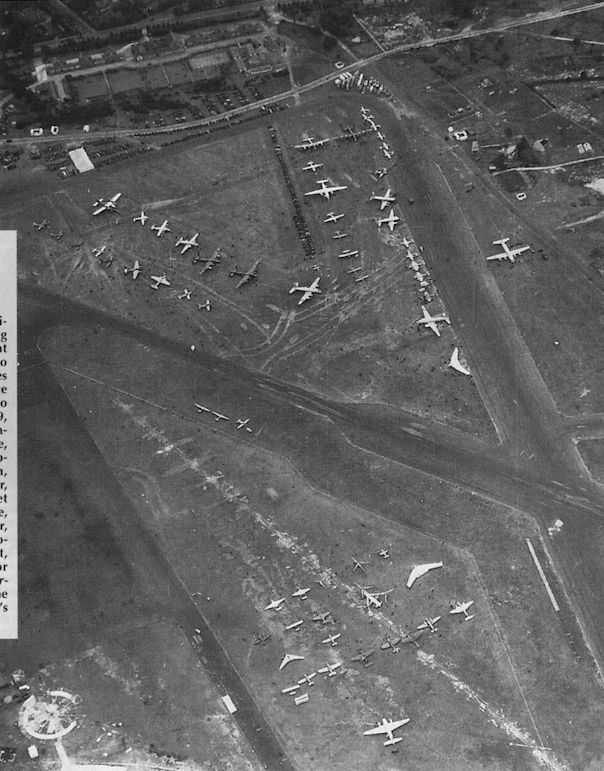 Panoramic view of the participants of the 1948 SBAC Farnborough show, headed by one of the two A.W.52s present. The aircraft are assembled on the north side of the airfield and 50 took part in the flying programme.