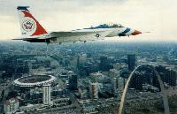 A McDonnell Douglas F-15 in a new Bicentennial colour scheme, first displayed on July 4, 1976, over the St Louis riverfront Gateway Arch.