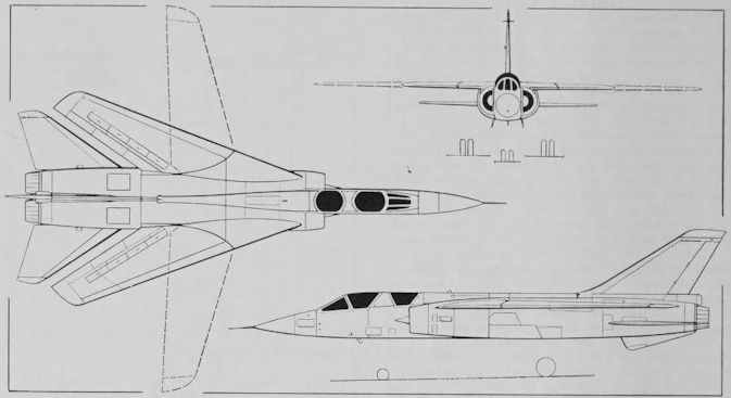 Dassault project for the French A.F.’s ACF "Avion de Combat Futur" requirement, the Mirage G 8A - shown here in model form - is based on the swing-wing G 8 but has fixed wings with 55" sweep and is powered by two 18,500-lb. s.t. SNECMA M 53 turbofan engines. Mach 3 performance is anticipated. A single-seater, the ACF is intended primarily for air defence but will also be able to undertake ground-attack and long-range reconnaissance missions