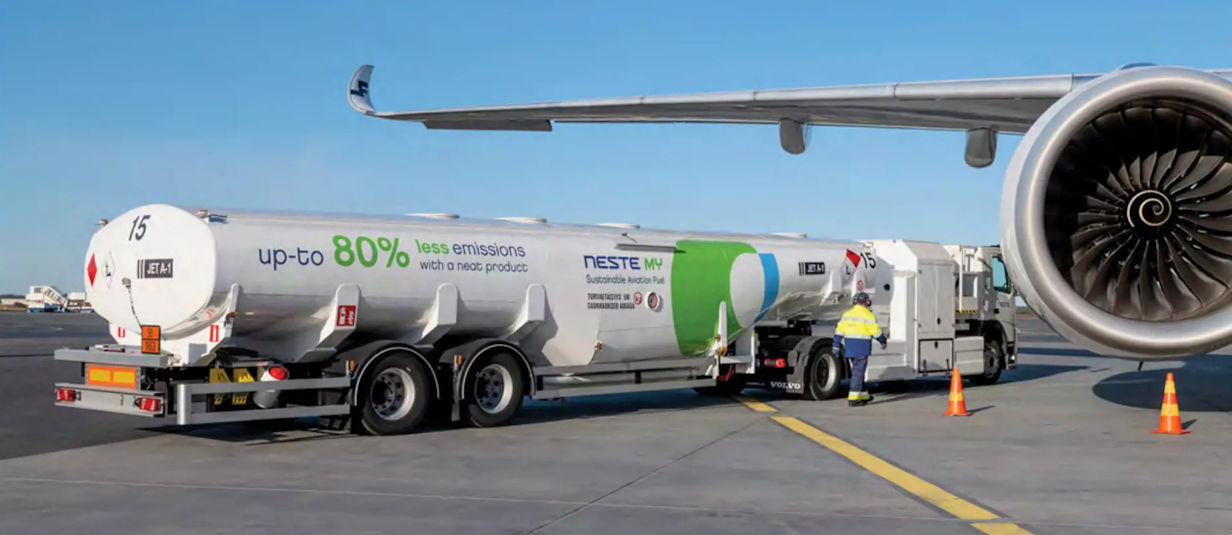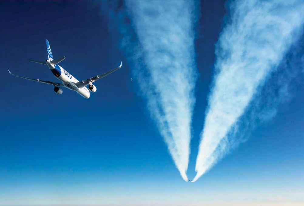 Research continues into the effects of sustainable aviation fuels. Here the German DLR Falcon 20 trails an Airbus A350 using 100% SAF supplied by Neste