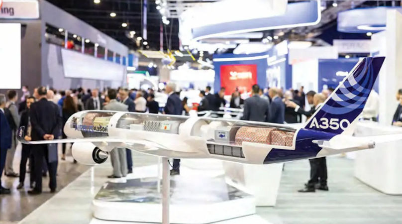 An Airbus A350 XWB flying display on the third day of the 2021 Dubai Airshow