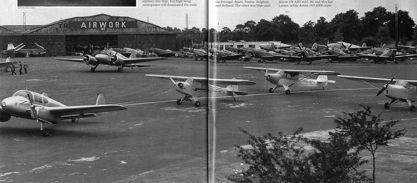 A line-up of visiting aircraft at the Gatwick rally. Piper Cub PH-NCU was unfortuinately involved in a fatal crash on its return flight. In the background a number of Spitfires await attention from Airwork, in front of three Saudi Lodestars.