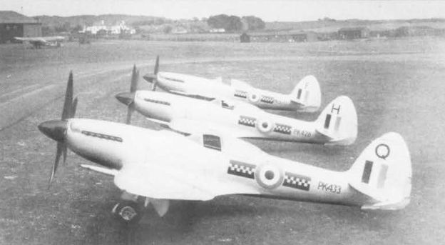 Регистрационный номер: PK312 [11] Spitfire Mk 21 (на переднем плане) в одном строю с прототипом Mk 22 (PK312). Лишь Mk 21 успели принять участие в войне. Хотя Mk 22 и Mk 24 поступили на вооружение в конце 1940-х годов, служба их была недолгой из-за наступления эпохи реактивной авиации.