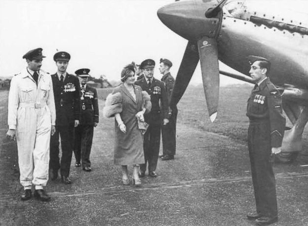 October 1, 1949, Biggin Hill: first inspection by Queen Elizabeth, as Honorary Air Commodore, of 600 (City of London) Squadron. Left to right, Fg Off Keith Hazelwood, author, Air Cdre Akerman, HM (wearing squadron badge), Sqn Ldr David Proudlove, LAC Rogers with author's Spitfire 22.