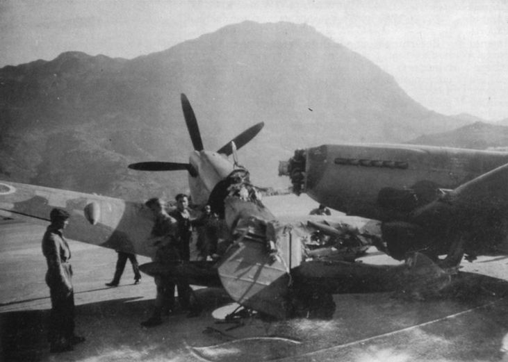 The officer seen standing next to the remains of his Spitfire F.R.XVIII is Colin Sloan. He escaped with just one stitch in his nose.