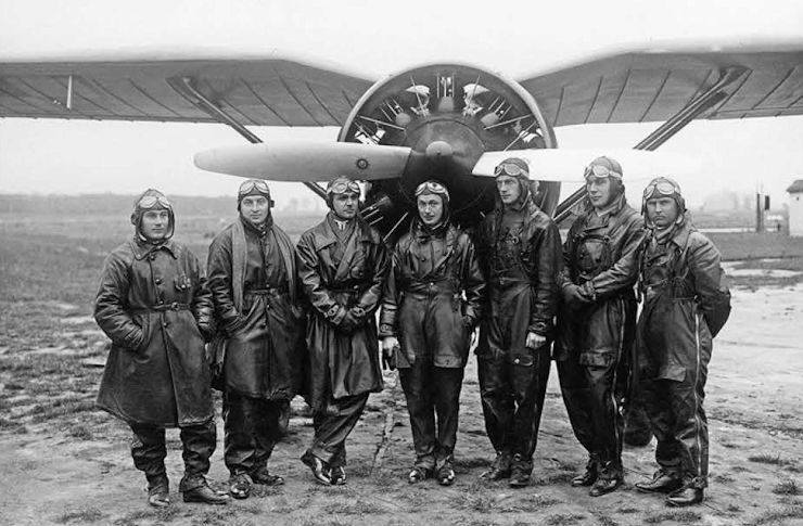 Элита вооружённых сил Польши начала 1930-х гг. Пилоты 2-го истребительного авиадивизиона польских ВВС на фоне новейшего на тот момент истребителя PZL P-7a, 1933 г. Слева направо: поручики А. Вчелик и Я.Черны, капитаны К.Низдзеведский и И. Бабан, поручик Б. Косинский, капралы К. Пняк и С. Мачек.
