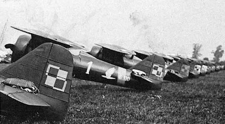 Регистрационный номер: 6.110 Линейка истребителей P-7a 123-й истребительной эскадры польских ВВС на аэродроме Краков. Лето 1939 г.