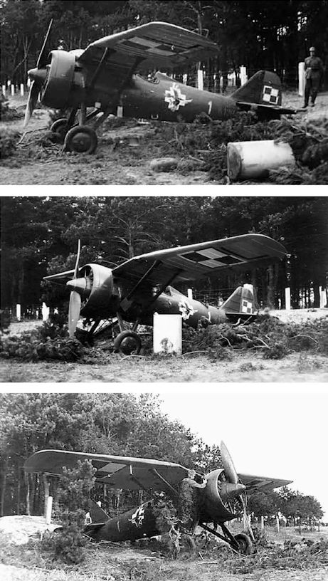 Метаморфозы польского истребителя P-7a (судя по номеру «999», он принадлежал какому-то учебному подразделению), захваченного немцами исправным в р-не Лодзи в начале сентября 1939 г. На первом фото истребитель просто стоит, на втором его, ради должного эффекта, поставили «на попа», но для фиксации «полной победы» немецким фотографам показалось мало и этого, поэтому на третьем фото P-7a заснят ещё и в окружении учебных RWD-8 и многочисленных устаревших «Потэ-25». Фото сделаны в сентябре-ноябре 1939 гг.