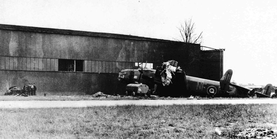 Регистрационный номер: DT727 Halifax II DT727 of No.138 Squadron's Polish Flight was practicing three-engined landings on 22 June 1943 when it all went wrong. The aircraft finished up against No.2 Hangar and was written off. Only two of the crew were injured