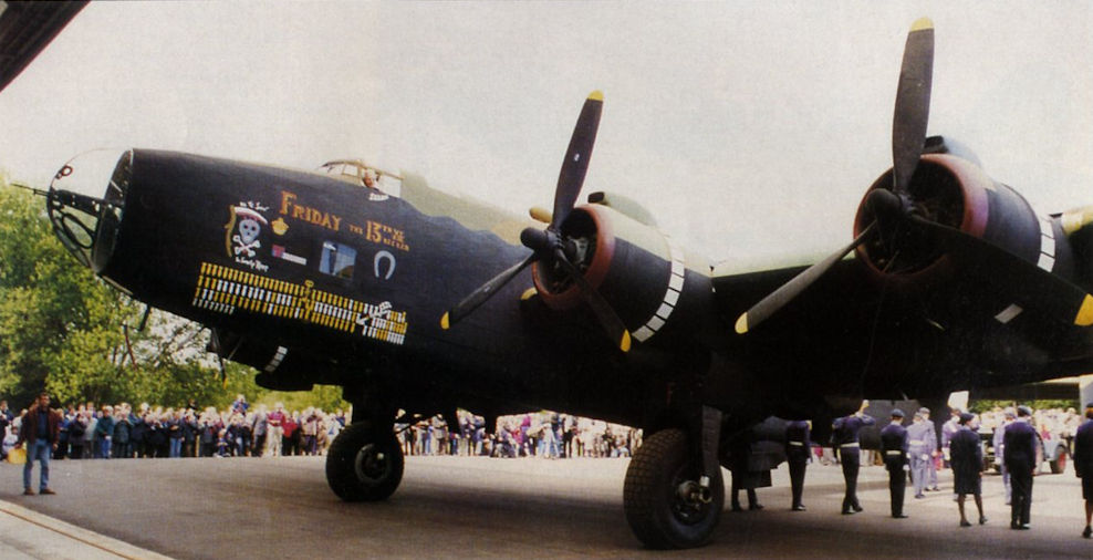 Регистрационный номер: LV907 [7] Halifax re-creation Friday the 13th being mobbed during its rollout at the Yorkshire Air Museum in September 1996.