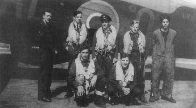 Авиабаза Лиссет. Флайт-сержант Д. Кэмерон из 158-й эскадрильи запечатлен с членами своего экипажа в пробоине фюзеляжа поврежденного Halifax. Пробоину самолет получил во время очередного рейда в 1943 году. После ремонта самолет вернулся в строй.