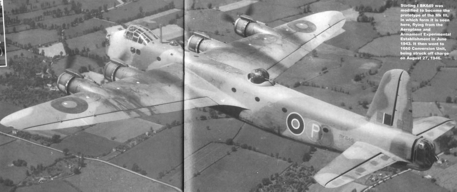 Регистрационный номер: BK649 Stirling I BK649 was modified to become the prototype of the Mk III, in which form it seen here, flying from the Aeroplane and Armament Experimental Establishment in June 1943. It then went to 1660 Conversion Unit, being struck off charge on August 27, 1946.