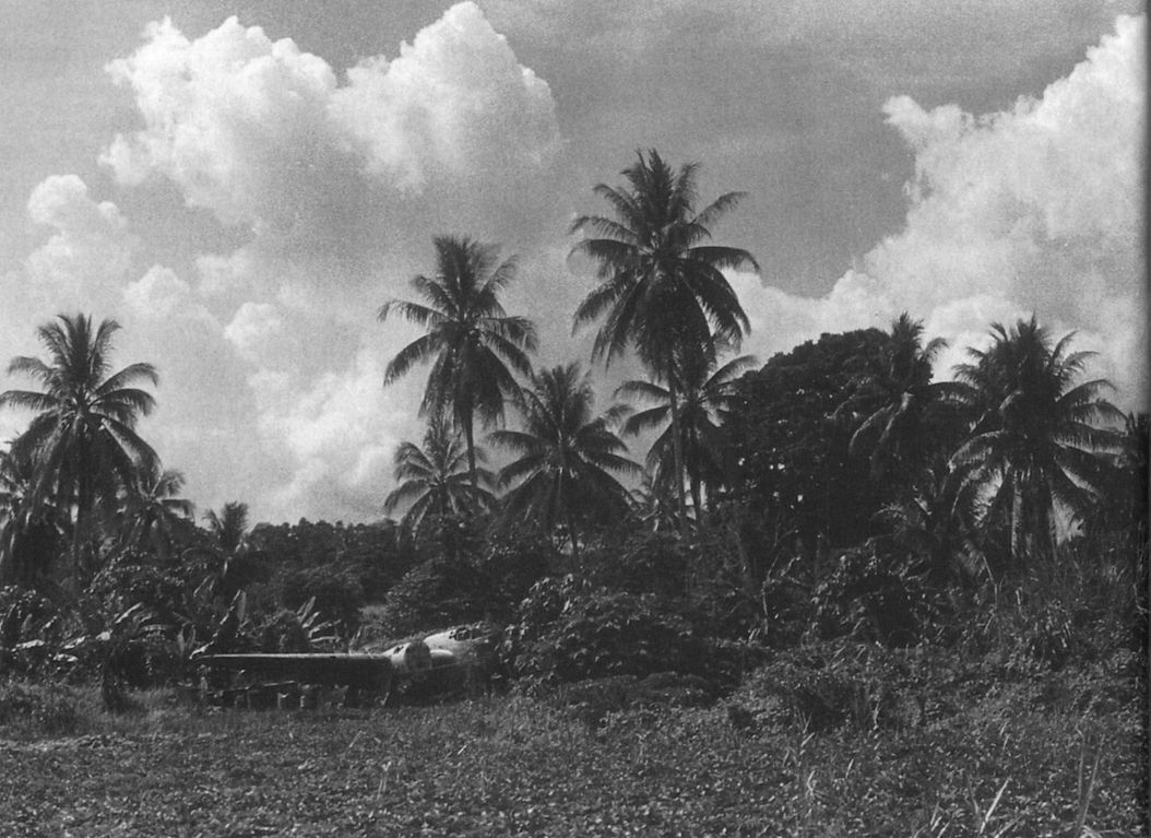 Jungle beside the runway at Awar on the north coast of New Guinea reclaims the abandoned Nakajima Ki-49 Donryu (Storm Dragon) Army Type 100 heavy bomber of the Japanese Army Air Force. The Allied codename for the Ki-49 was “Helen”.