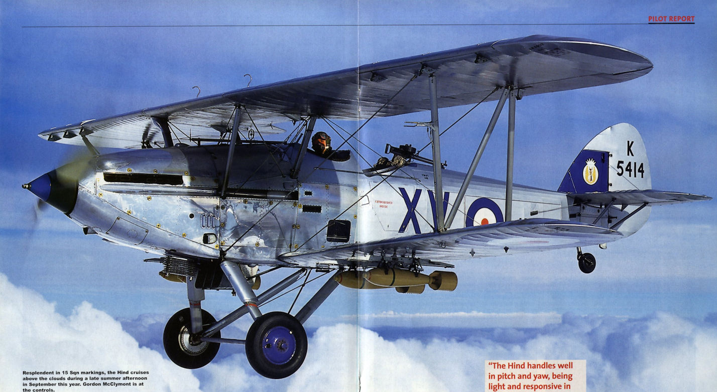 Регистрационный номер: K5414 [14] The Hind was a modern design, its fabric-covered, tubular Warren-girder primary fuselage structure having originated with the Hawker Hart. Here, the fabric may be seen bulging between the wing ribs.