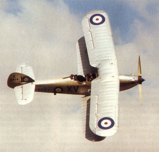 Регистрационный номер: K4636 [13] An impressive plan view of K4636, the first production Hind, taken during a sortie from Brooklands, emphasizes the contrast between the swept upper wing and the straight lower wing. Note also the underwing bomb carriers.