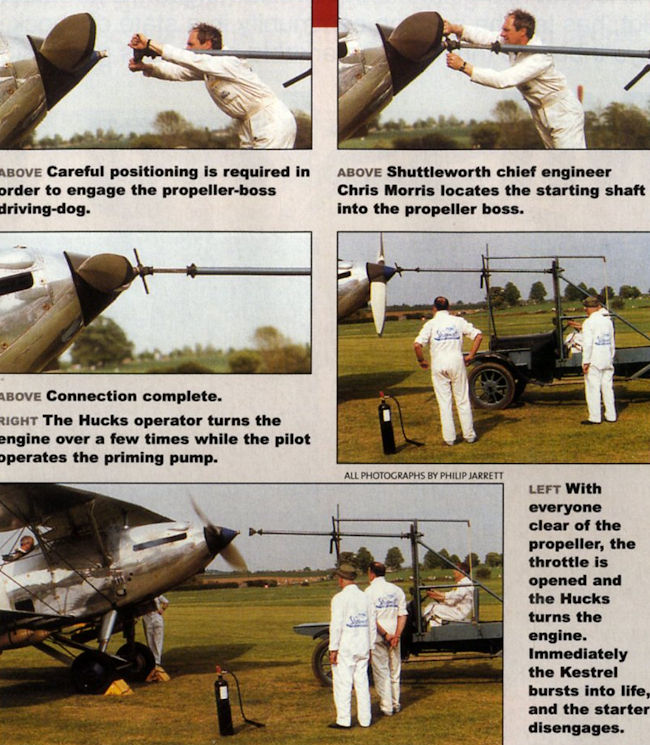 Mechanised starting. 1. Careful positioning is required in order to engage the propeller-boss driving-dog. 2. Shuttleworth chief engineer Chris Morris locates the starting shaft into the propeller boss. 3. Connection complete. 4. The Hucks operator turns the engine over a few times while the pilot operates the priming pump. 5. With everyone clear of the propeller, the throttle is opened and the Hucks turns the engine. Immediately the Kestrel bursts into life, and the starter disengages.