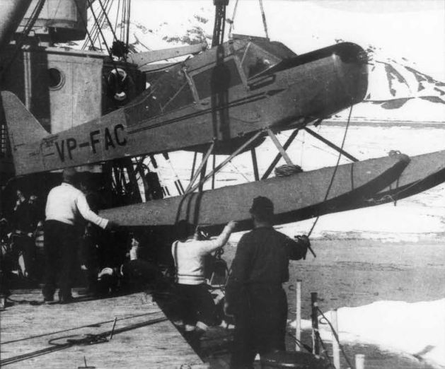 Регистрационный номер: VP-FAC [5] Auster Mk V VP-FAC photographed after taking some Falkland Islands Dependency representatives for a local demonstration. The launch crew uses a rowing-boat tender to make fast the towline.