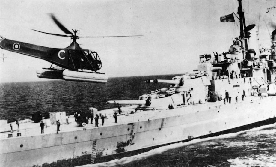 Hovering alongside the battleship 'Vanguard' is a Hoverfly of No.771 Squadron