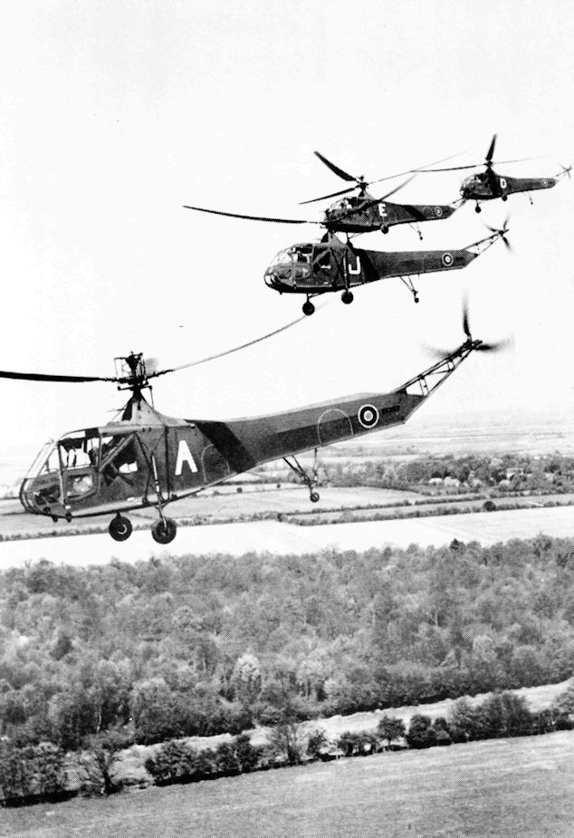 The British version of the Sikorsky VS-316, designated R-4 by the USAAF, was called the Hoverfly I. It was operated by No 529 Sqn RAF, No 705 Sqn FAA and No 771 Fleet Requirements Unit. Seen here are R-4s KK990 (D), KK995 (E), KK994 (B) and KL103 (J). -